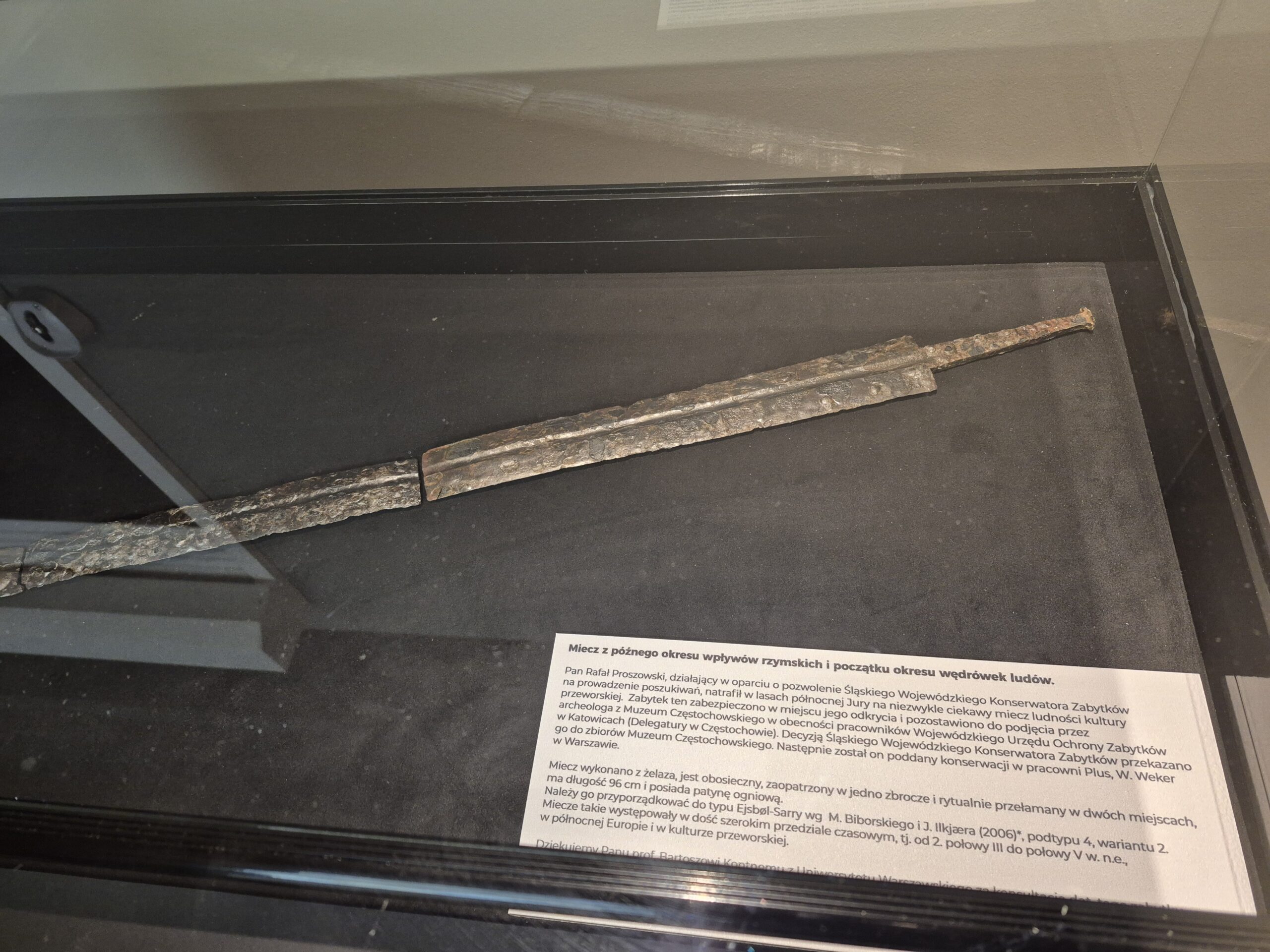 Miecz został odnaleziony przez Pana Rafała Proszkowskiego i Pana Krzysztofa Lampę, działających w oparciu o zgody Śląskiego Wojewódzkiego Konserwatora Zabytków na przeprowadzanie poszukiwań. W lasach północnej Jury natrafili na bardzo ciekawy miecz ludności kultury przeworskiej. Zabytek został zabezpieczony w miejscu odnalezienia i pozostawiono go do czasu podjęcia przez archeologa z Muzeum Częstochowskiego. Decyzją Śląskiego Wojewódzkiego Konserwatora Zabytków przekazany został do muzeum, następnie do pracowni Plus, W. Weker w Warszawie.