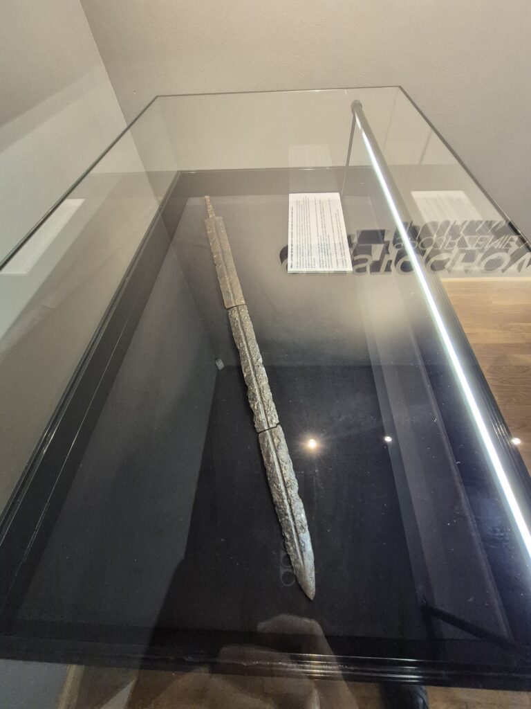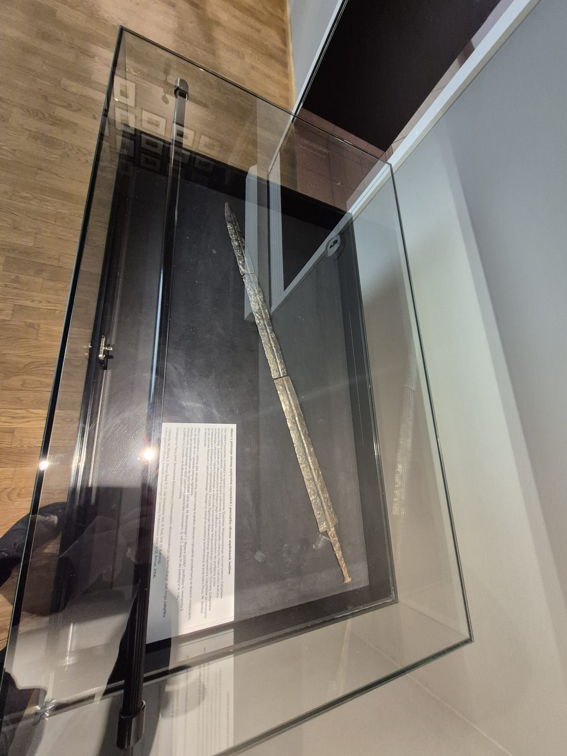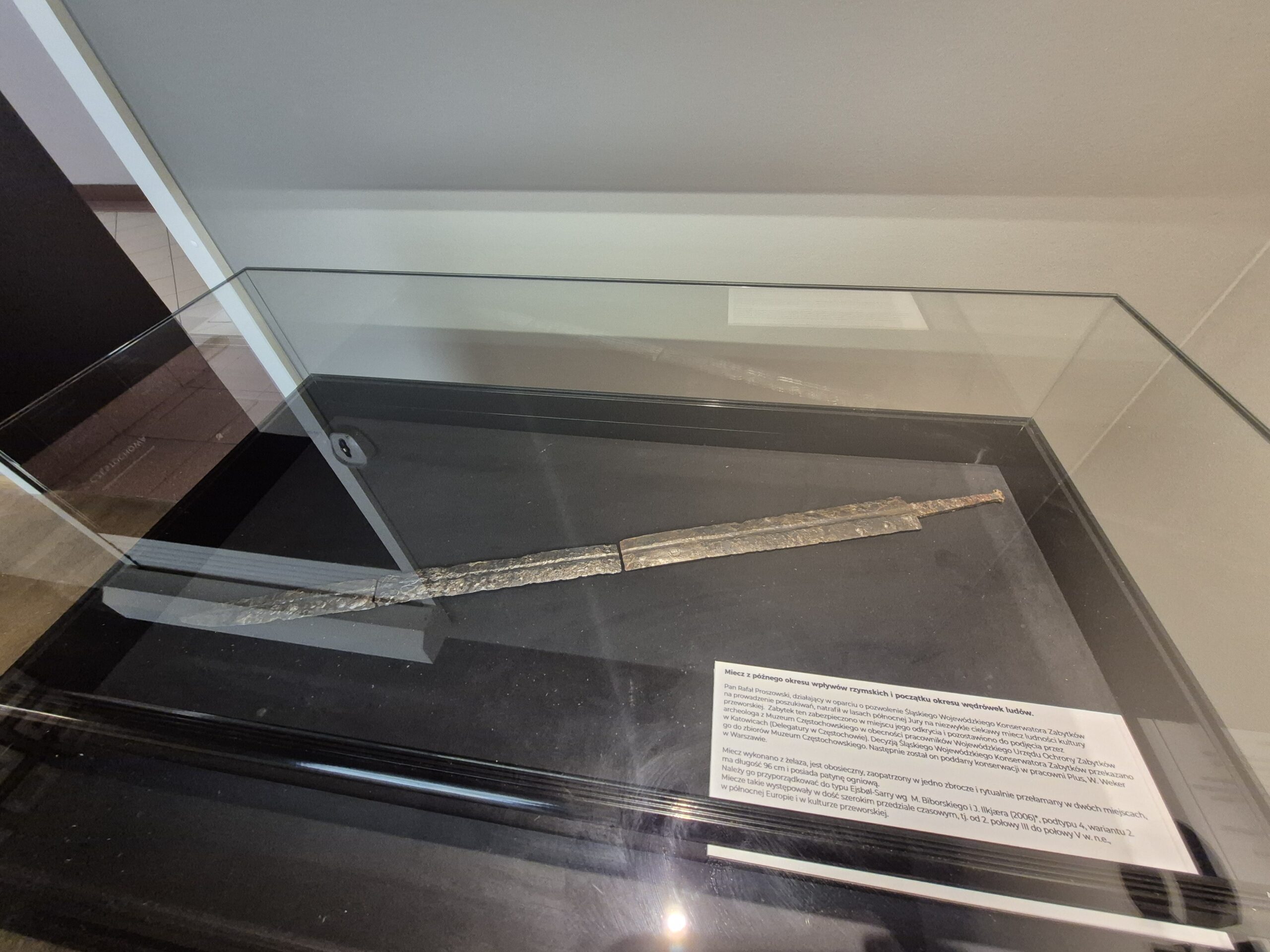 Na podstawie przeprowadzonych prac i analiz, wiemy, że miecz został wykonany z żelaza, jest obosieczny, zaopatrzony w jedno zbrocze i rytualnie przełamany w dwóch miejscach. Mierzy 96 cm i posiada patynę ogniową.